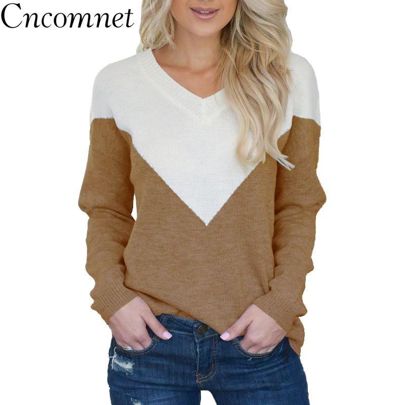 Women Knitting Tops Sexy V Neck Patchwork Features Color Matching Comfortable Long Sleeves Tops